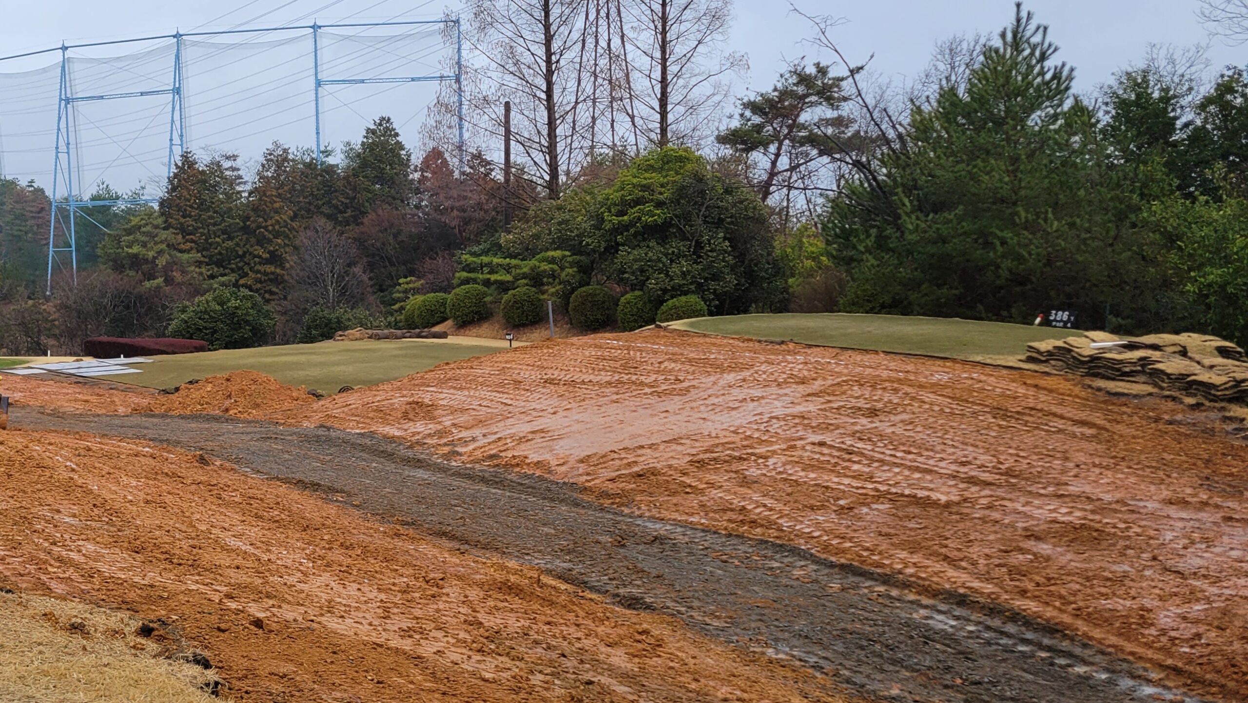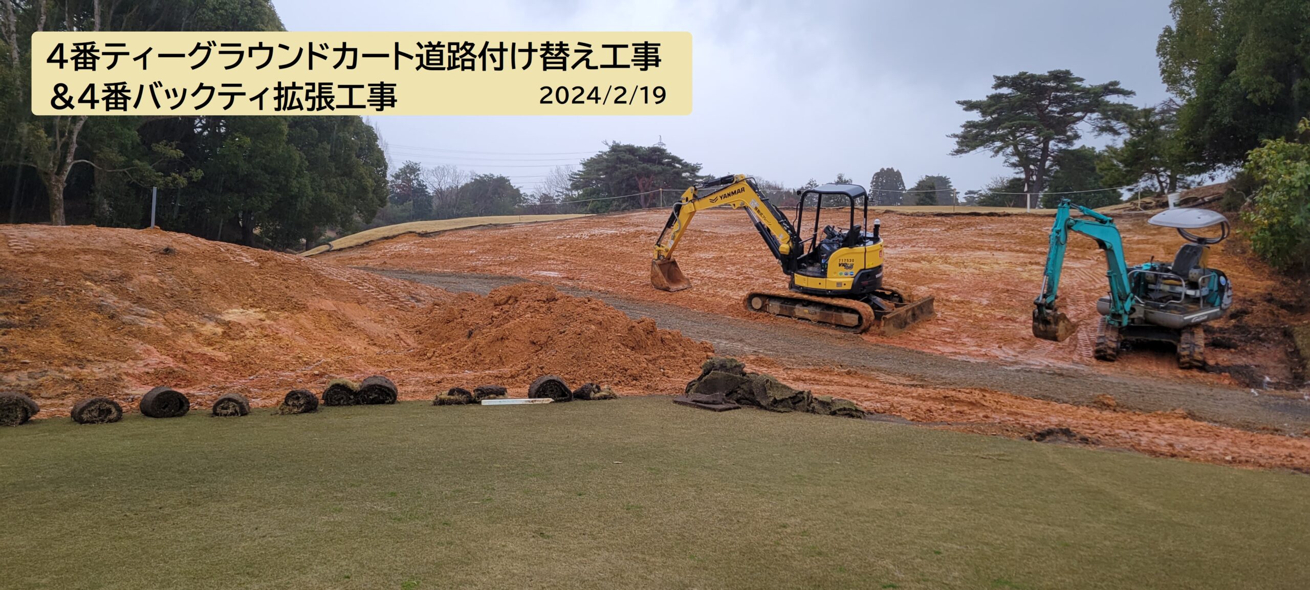 現在、4番ホールのティーグラウンド横のゴルフカート道路をこれまでの高さより下げて低くする工事を行うとともに、4番ホール バックティグラウンドの拡張工事行っています。