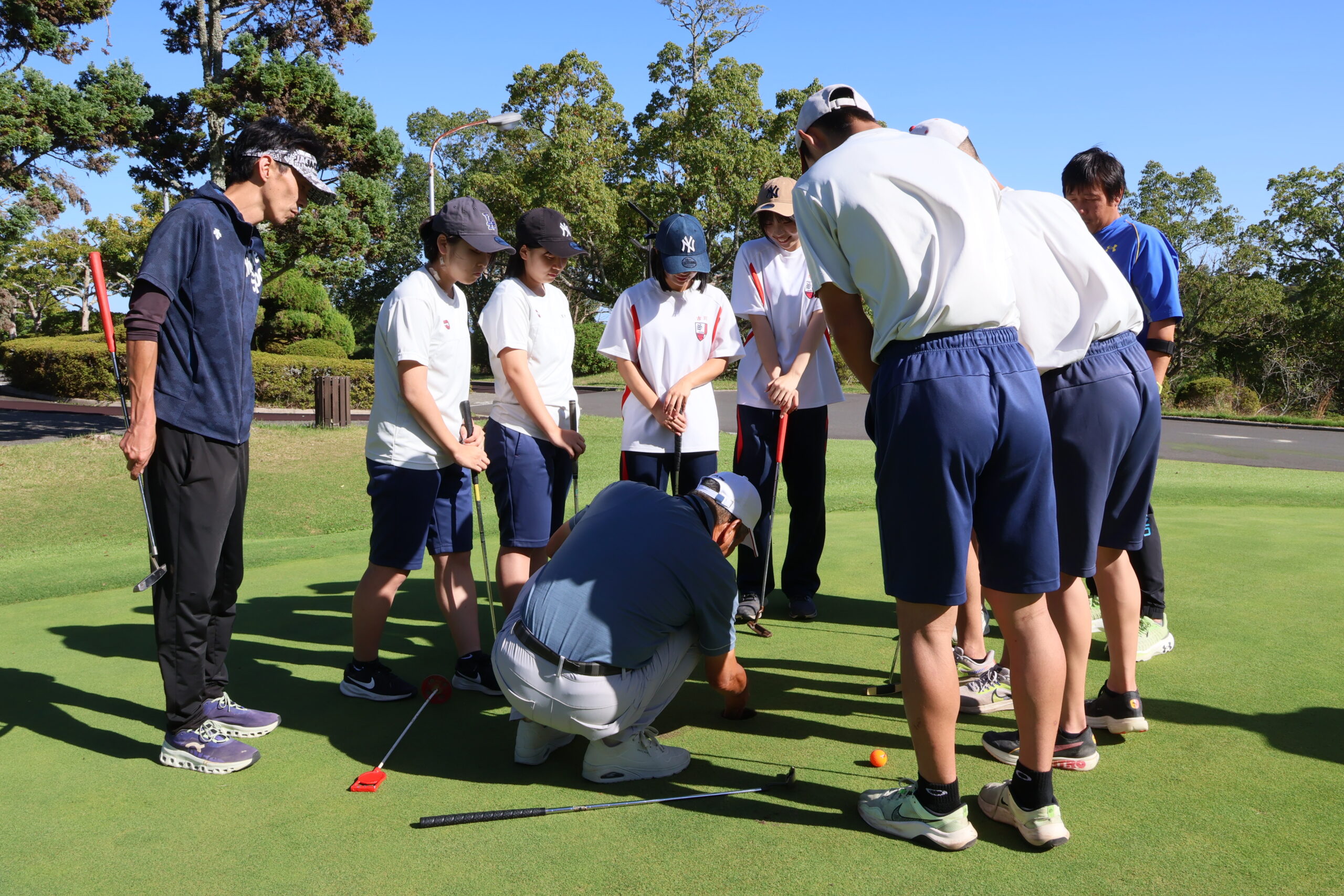 パッティンググリーンではパット練習だけでなく、ホールカップについて学んだりもしました。