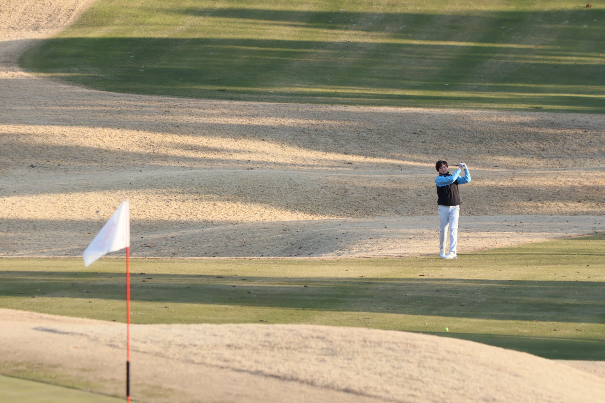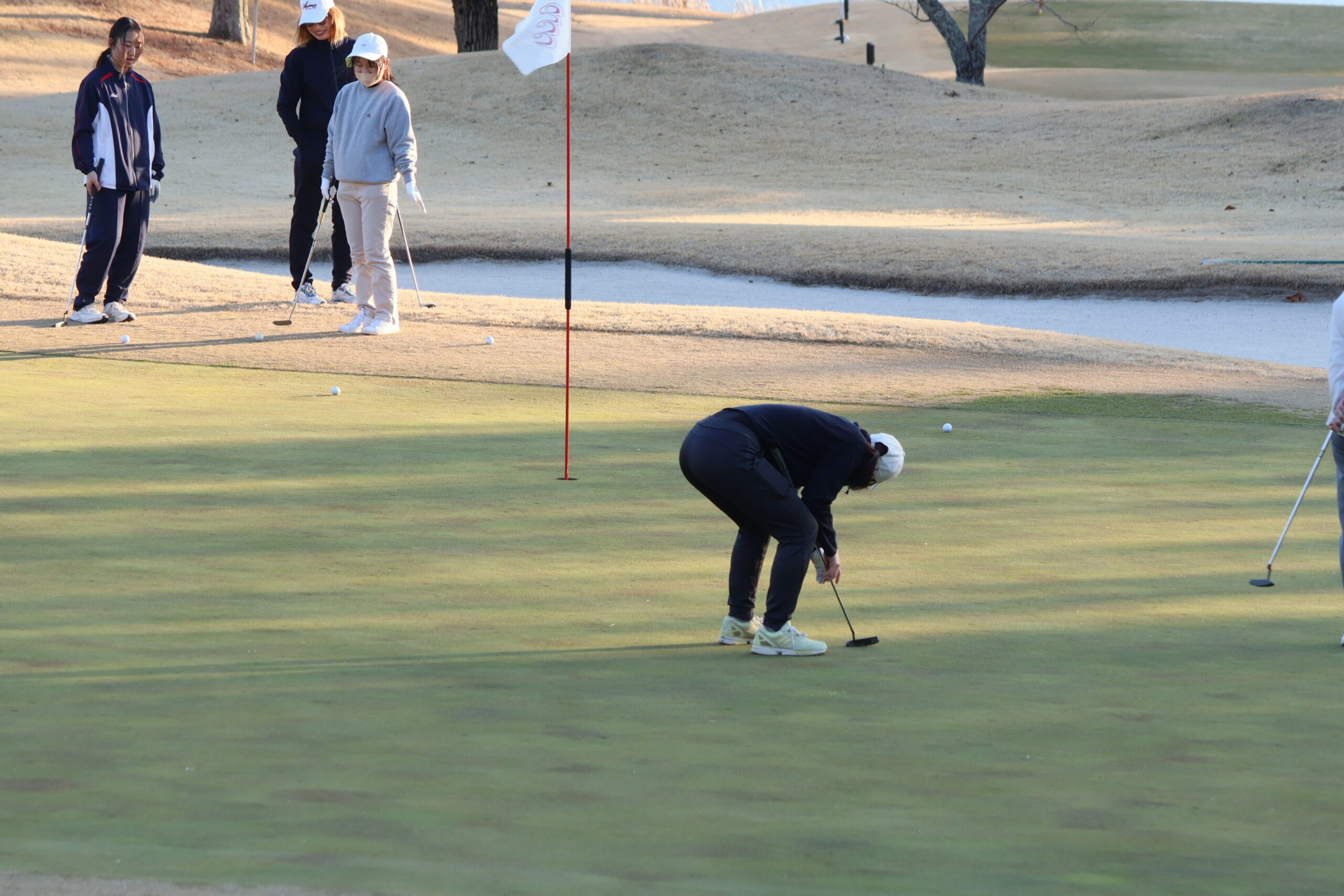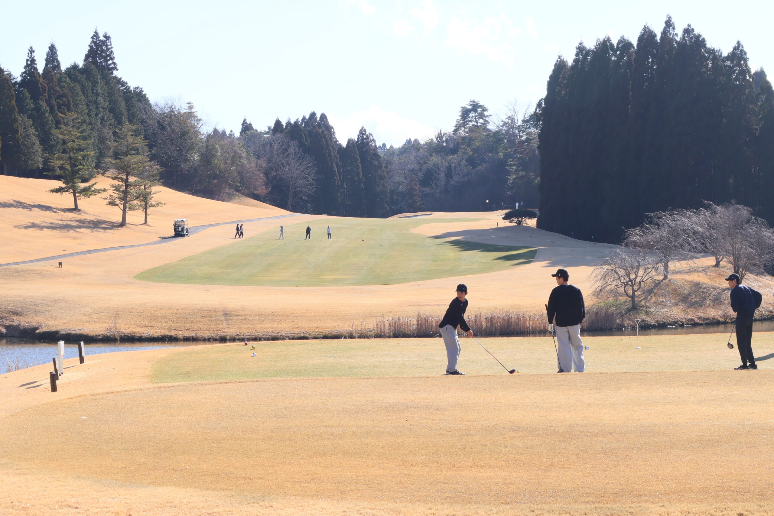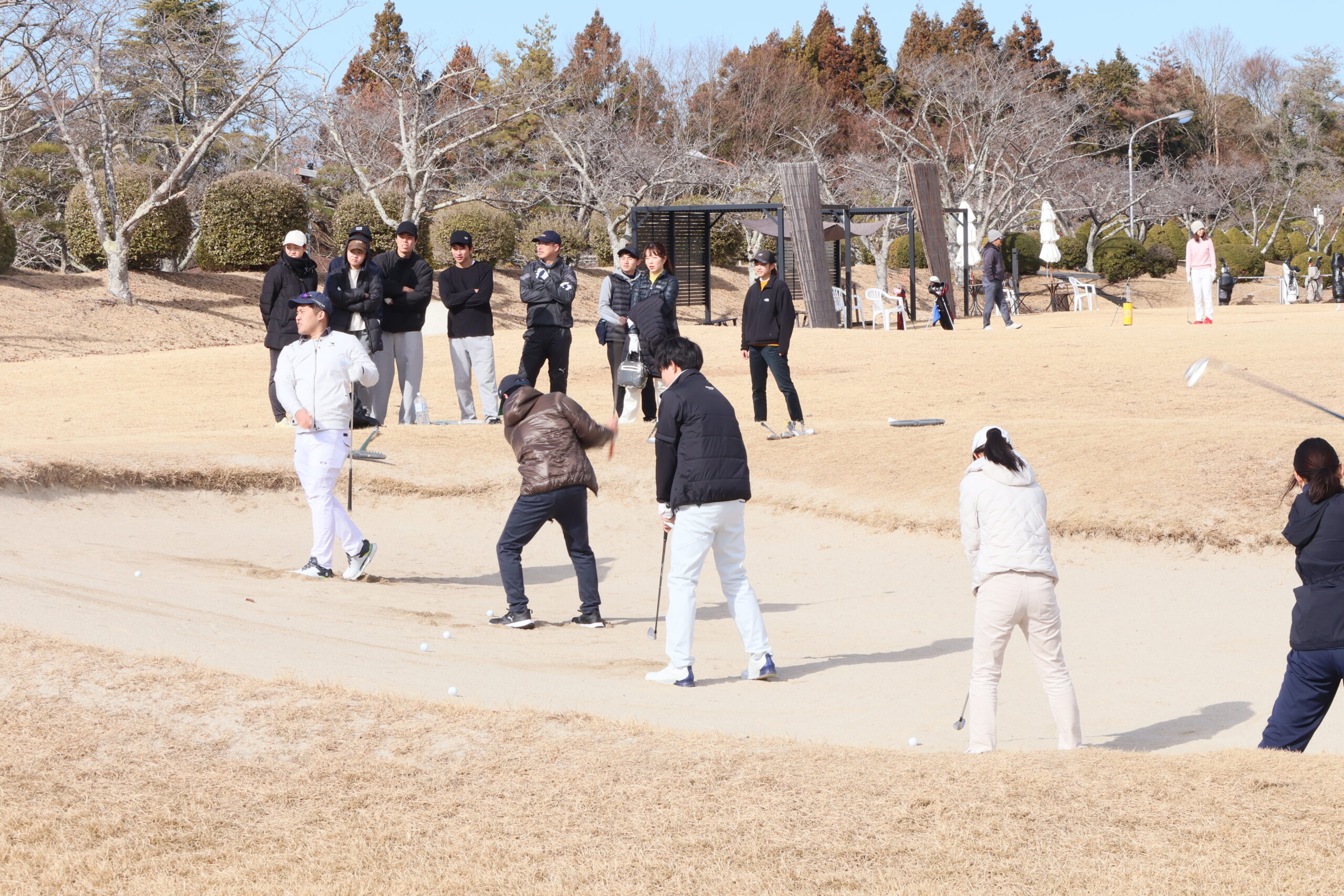 一日課外授業のため、午前はドライビングレンジでのショット練習やアプローチ、パット、バンカーの練習をおこない、食事を挟んで午後からはコースへ。